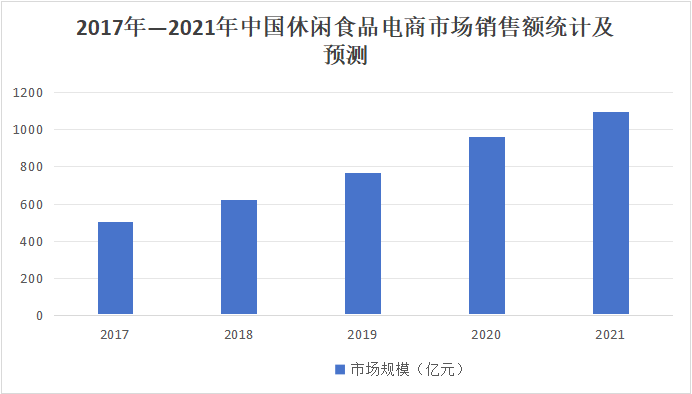 休闲食品作为居民日常消费品类之一,随着网络消费市场的崛起,经历了由传统销售渠道向现代销售渠道的转变。随着中国休闲食品电商渠道渗透率的不断走高,中国休闲食品电商市场销售额亦不断增长。2019年,中国休闲食品电商销售额达766.7亿元。2020年,中国休闲食品电商销售额预估达964亿元,预估较2019年增长25.7%。中商产业研究院预测,2021年我国休闲食品在电商平台的销售额可达1095.6亿元。