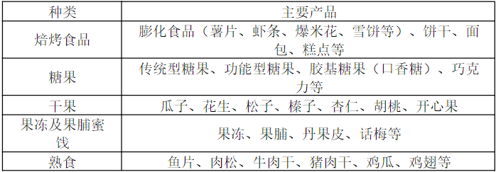 休闲食品俗称“零食”,是快速消费品的一类,是指人们除主食以外,在闲暇、休息时所吃的食品。休闲食品通常具有便携性、易于食用且滋味丰富等特点,主要用来消磨时间、满足口欲、增加乐趣等。休闲食品品类丰富,主要可分为焙烤食品、糖果、干果、果冻及果脯蜜饯、熟食五大类。