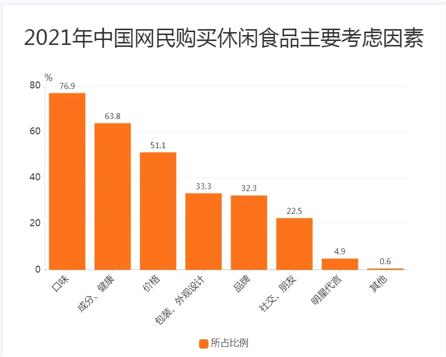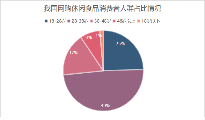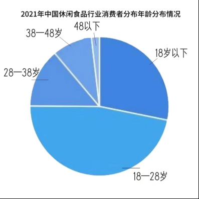 人群方面,我国休闲零食市场 2021 年 18-38 岁消费者占比合计约77.0%,其中28-38岁、18-28 岁、18 岁以下占比分别为 46.9%/28.2%/1.9%。年轻群体受网络及网红种草文化影响,休闲零食消费购买意愿相对较强,其中28-38岁消费者群体往往收入水平较高,休闲零食购买力强,婚育后家庭零食需求亦会增加;18-28 岁消费者部分具备基本经济独立能力,可贡献一定购买需求。