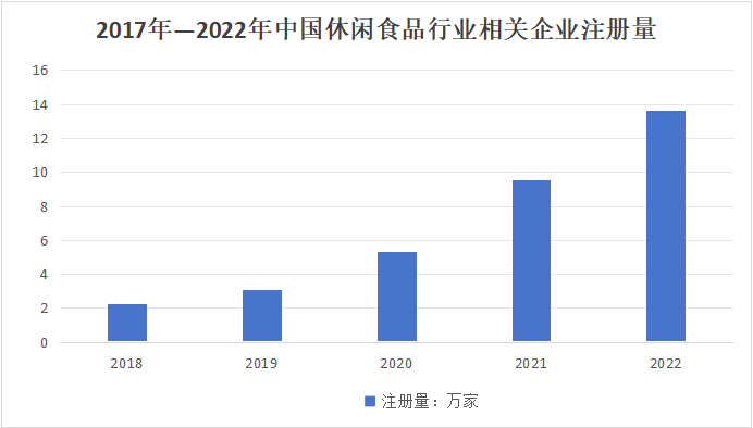 企查查数据显示,中国目前约有55.96万余家经营范围含“休闲零食”,且状态为在业、存续的企业。近年来,国内休闲食品相关企业数量呈稳步增长状态,其中2022年新增企业注册量达13.61万家,占相关企业注册总量的24.32%,为近年来增长最多的一年。