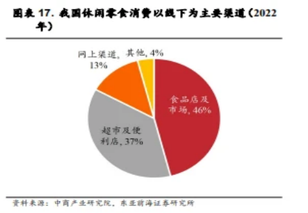 我国休闲零食市场以年轻消费者为主,线下为主要渠道。渠道方面,考虑到休闲零食消费的冲动属性,线下为主要销售渠道,2022年合计占比约 83%,其中食品店及市场占 46%,超市及便利店占37%。