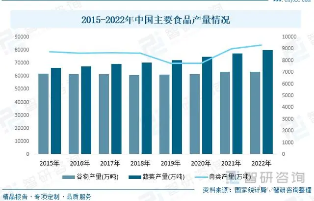 休闲食品产业的上游主要从原材料供应商采购所需的原材料。休闲零食的原材料主要包括各种谷物、糖、油等,各类食品是休闲食品的重要原材料,随着我国农作物种植面积及养殖规模化的不断推进,近年来我国谷物、蔬菜、肉类等产品产量稳步增长,为休闲食品行业的发展提供了充足的原料保障。据资料显示,2022年我国谷物产量为63324.34万吨,同比增长0.1%;蔬菜产量为79997.22万吨,同比增长3.2%;肉类产量为9328.44万吨,同比增长3.8%。