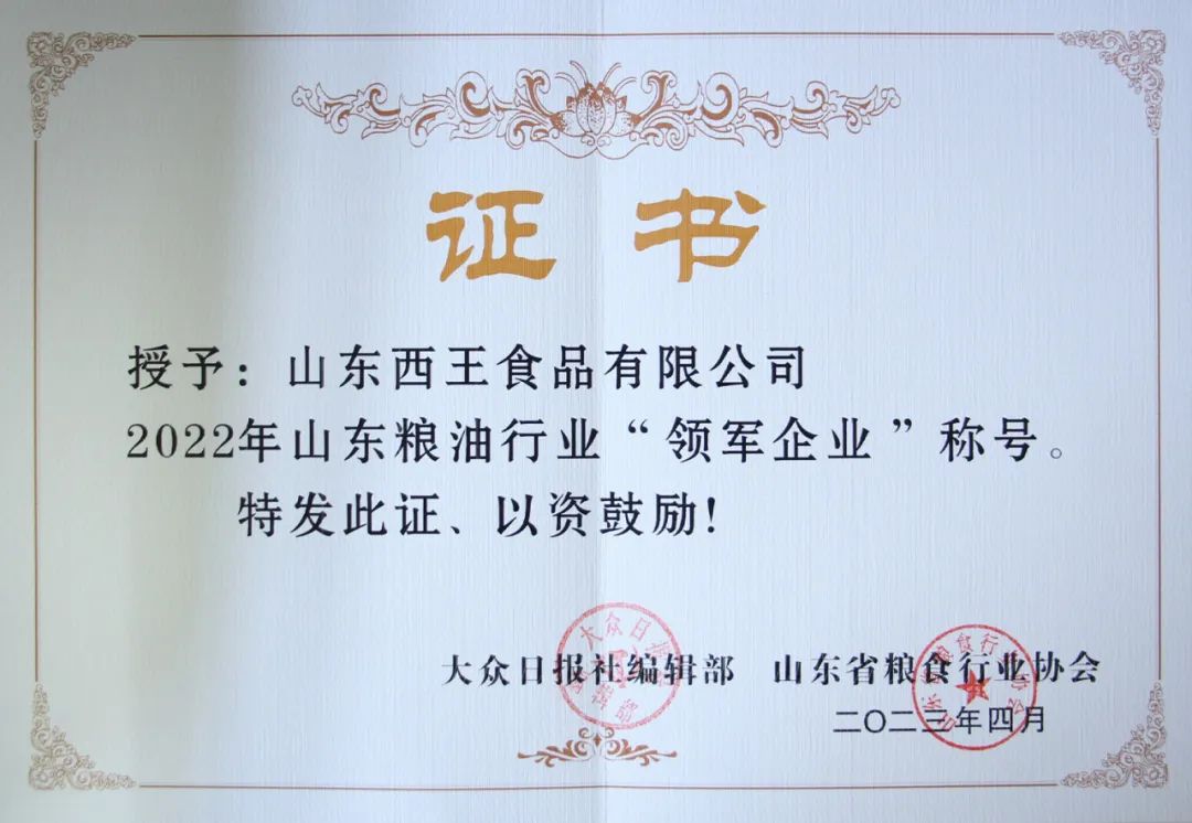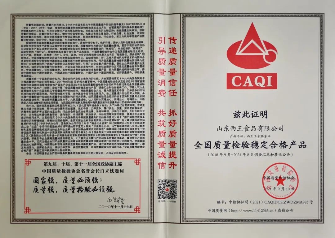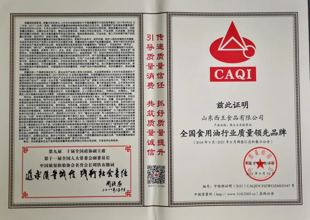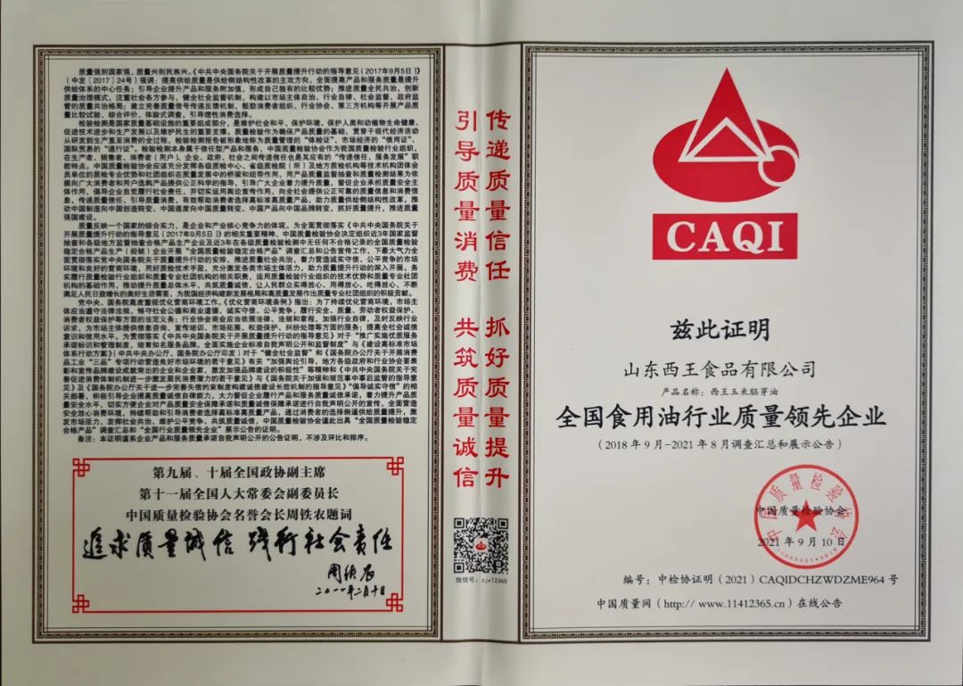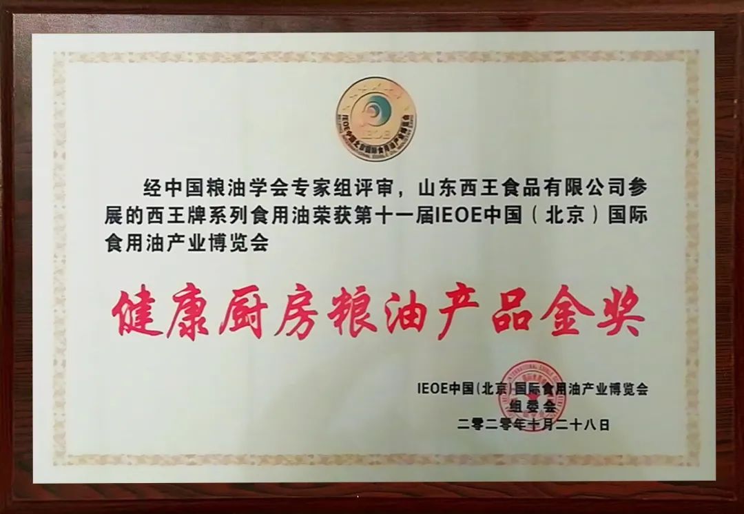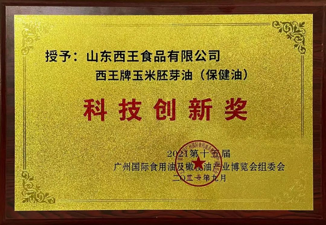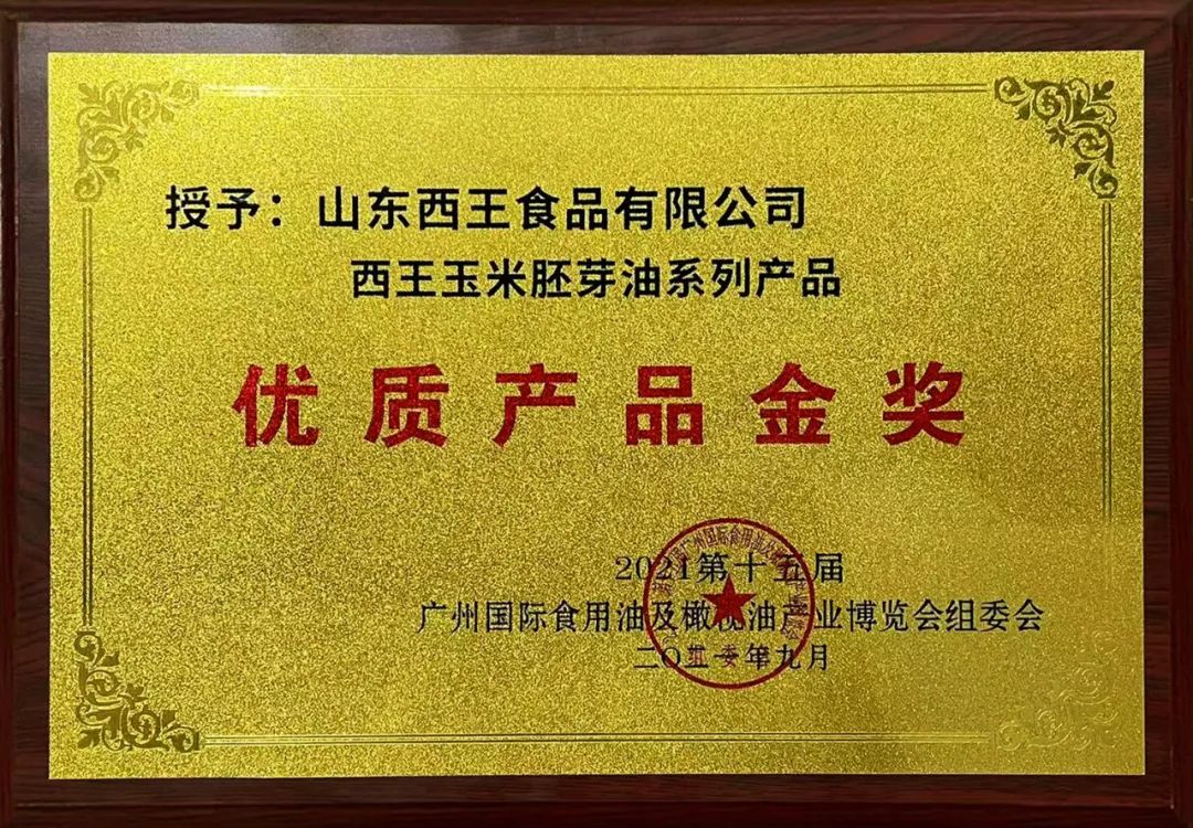 旗下产品连续多次荣获北京国际食用油产业博览会金奖,连续被评为山东名牌、放心粮油、中国好粮油产品,获得世界食品品质评鉴大会金奖,拥有“健”字号食用油批准证书。西王玉米胚芽油获得食用油行业第一张碳标签。