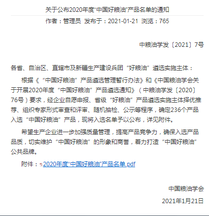 入选2020年度“中国好粮油”产品