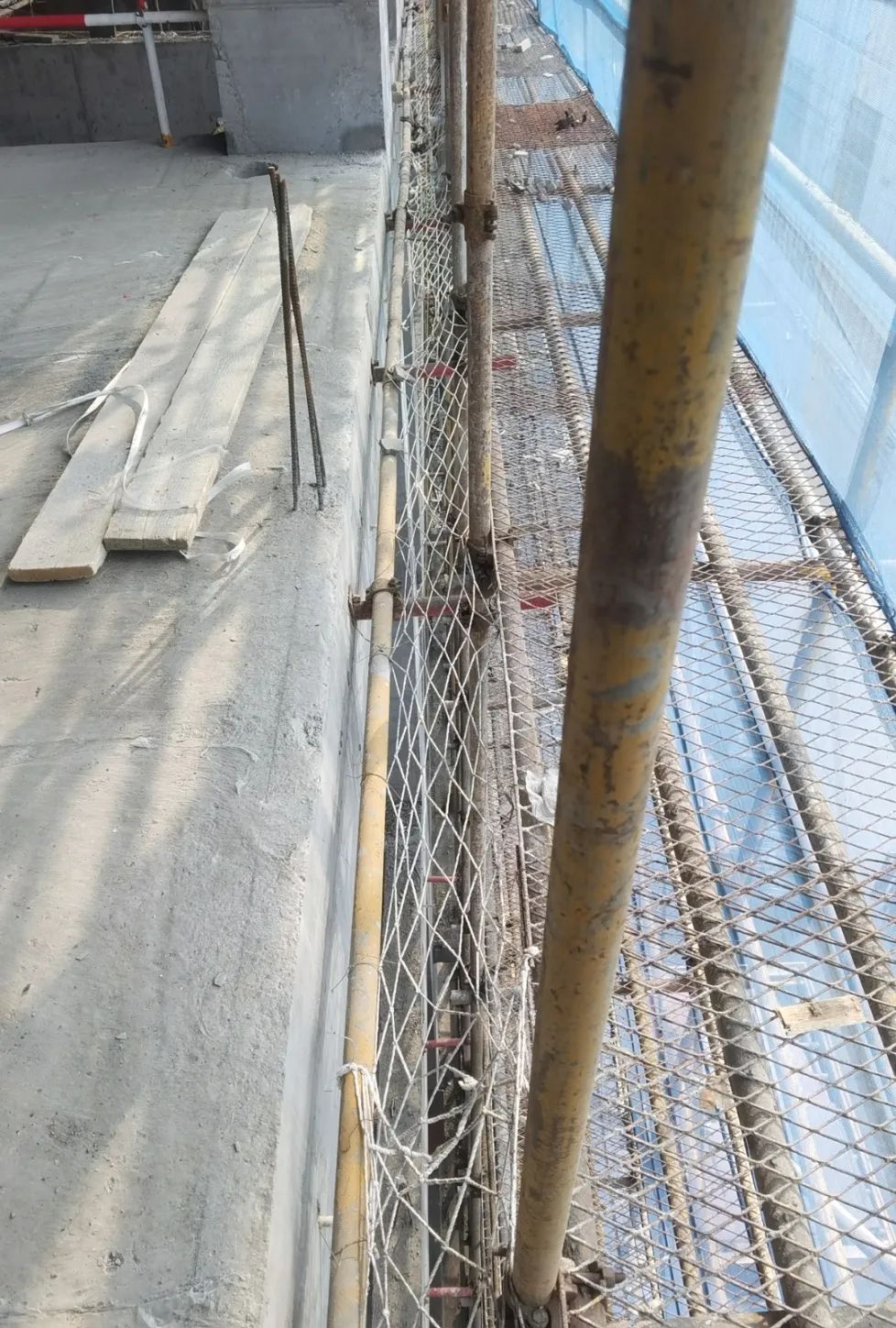 楼层与脚手架连接处水平安全网设置全面,连墙件搭设规范,并用红油漆涂刷。