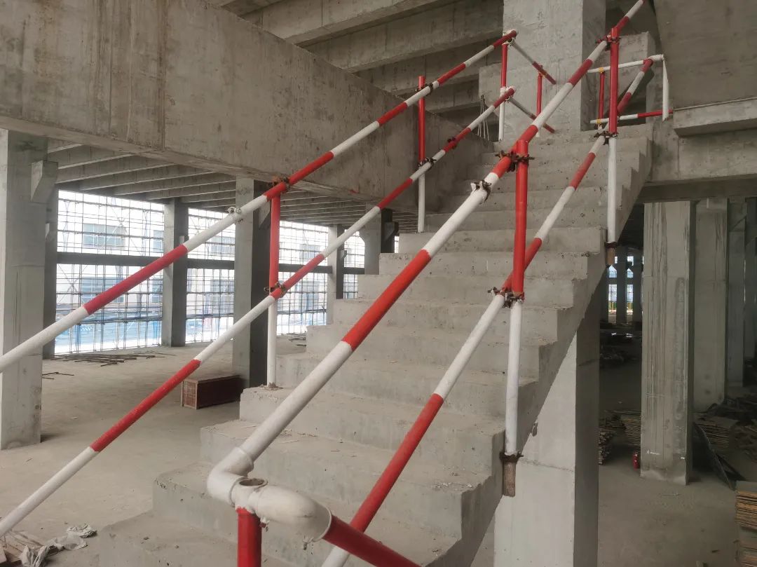 为了在安全文明方面更上一层楼,项目部也要求班组高度重视,楼梯扶手也用定型夹具固定钢管,做到美观大方。