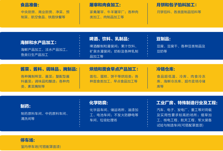 聚氨酯砂浆是兼具高强度和良好韧性的产品,在食品加工车间、仓库等场所人员、车辆频繁走动,聚氨酯砂浆产品可以有效应对此等场景。同时,聚氨酯砂浆地坪具备高度的耐磨、抗冲击性能,以应对食品行业长期对卫生标准的高要求。