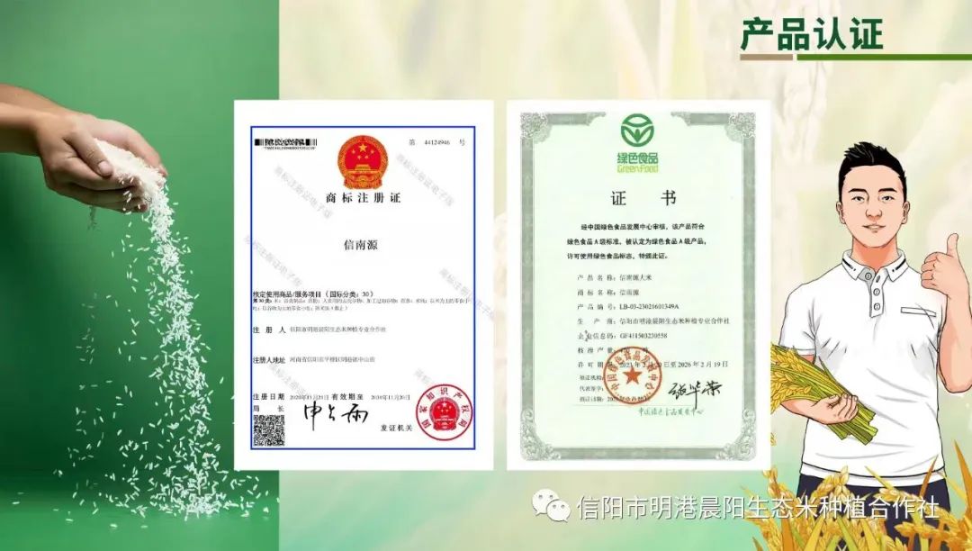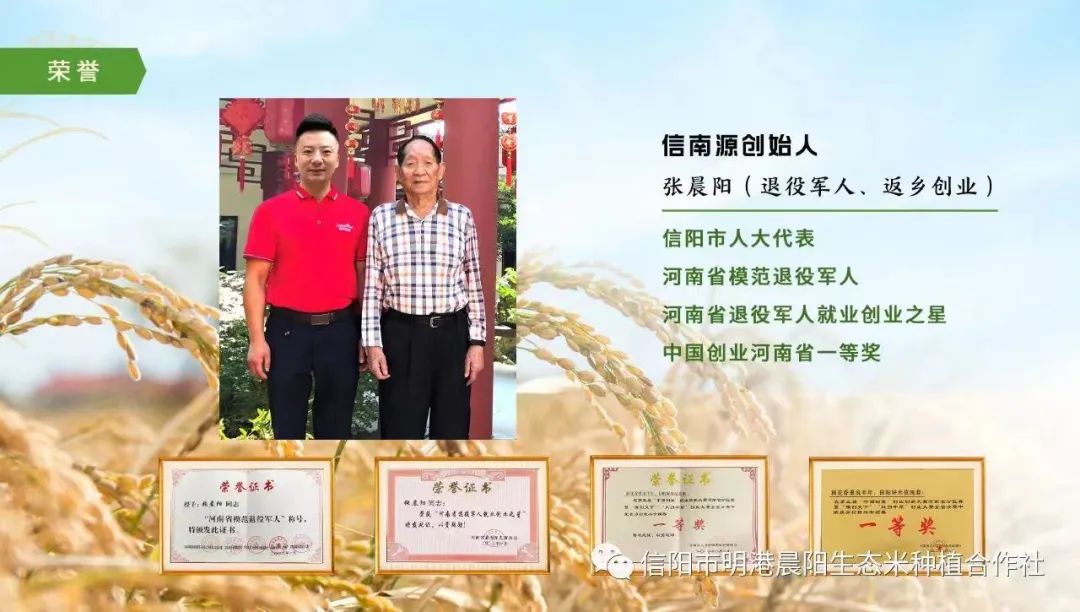 张晨阳退役不褪色,回到家乡,开发红色大别山,在大别山下种植山泉水灌溉的山泉米,立志通过自身企业发展带动乡亲致富,牢记军人使命,积极履行社会义务,充分体现军人担当。2015-2021年在平桥区推广高产优质水稻品种“晶两优 534”,累积推广面积达58万亩,直接带动粮食增收 1.74 亿元;优选种植基地1500 余亩、参与的农民种植专业合作社4家、联结农户980户、间接提供就业岗位2000余人次。2022年与1100余家合作社合作,订单种植优质大米12000亩,年产8256吨稻谷,5600吨优质大米。先后获得信阳市首届退役军人创业之星,河南省退役军人就业创业之星,河南省模范退役军人,中国国际“互联网联网+”大学生创新创业大赛一等奖,第五届“中国创翼”河南省创新创业大赛乡村振兴专项赛一等奖,2023年河南省高素质农民创新创业大赛二等奖,2023年信阳市首届退役军人直播电商创业创新大赛二等奖等荣誉称号和奖项。
