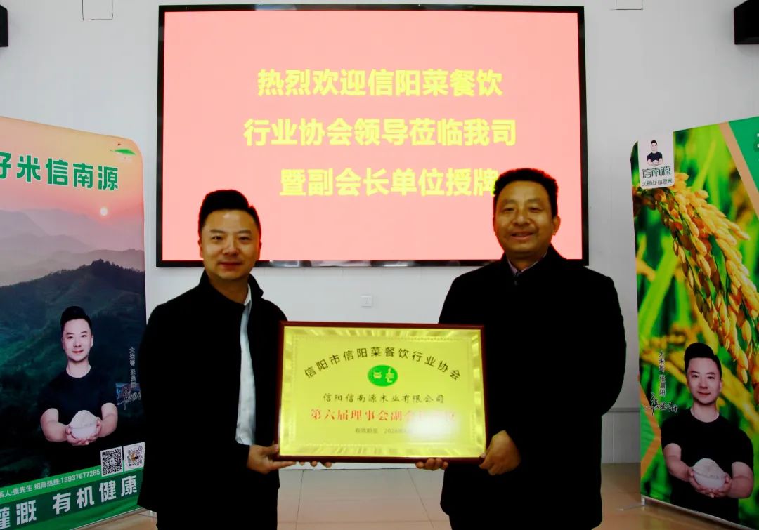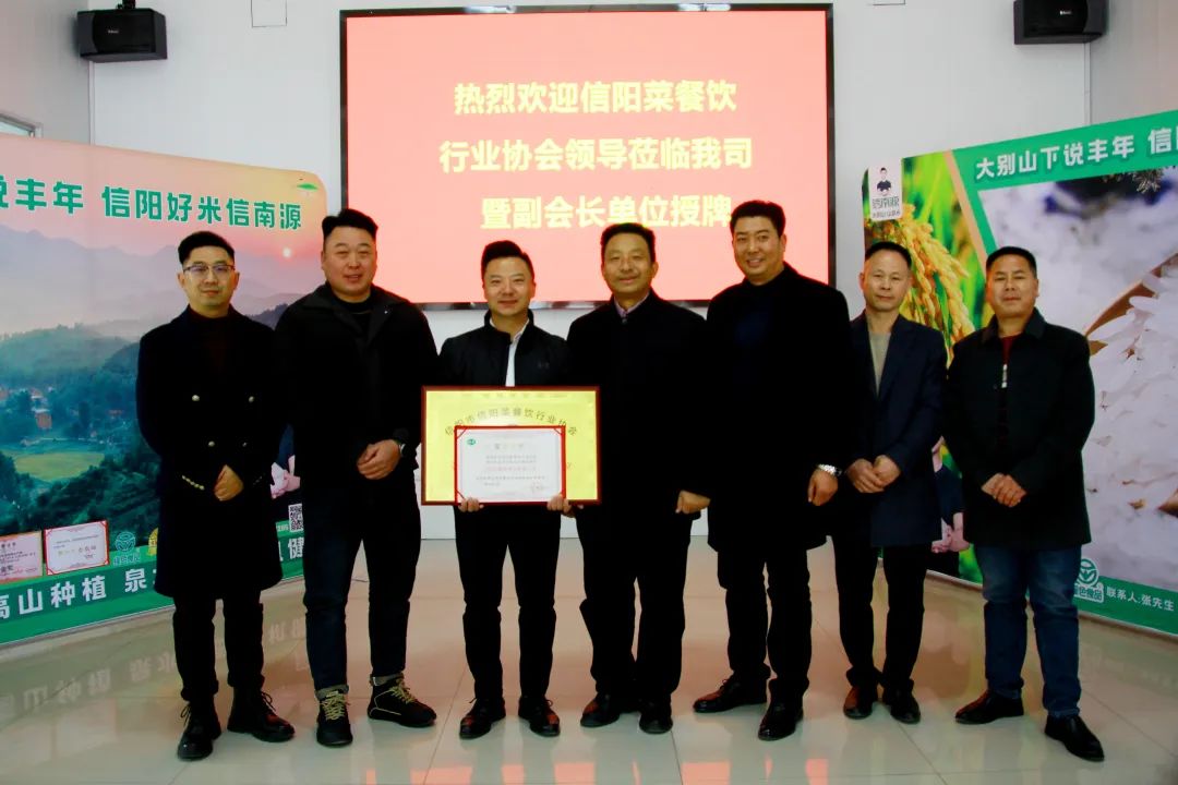 凝心聚力画蓝图,团结奋进创伟业。1月7日上午,信阳市信阳菜餐饮协会会长王天义带队前往位于平桥区明港镇的信阳市信南源米业有限公司参观考察,并在该公司内举行信南源米业的副会长单位授牌仪式。协会副会长穆长春、协会副会长兼食材委主席占国兵、协会副会长单位金池鱼业总经理屠金池陪同参观考察。信南源米业有限公司董事长张晨阳热情欢迎协会一行莅临参观考察,详细为大家介绍企业发展情况,并带领大家参观企业生产线和产品展厅。