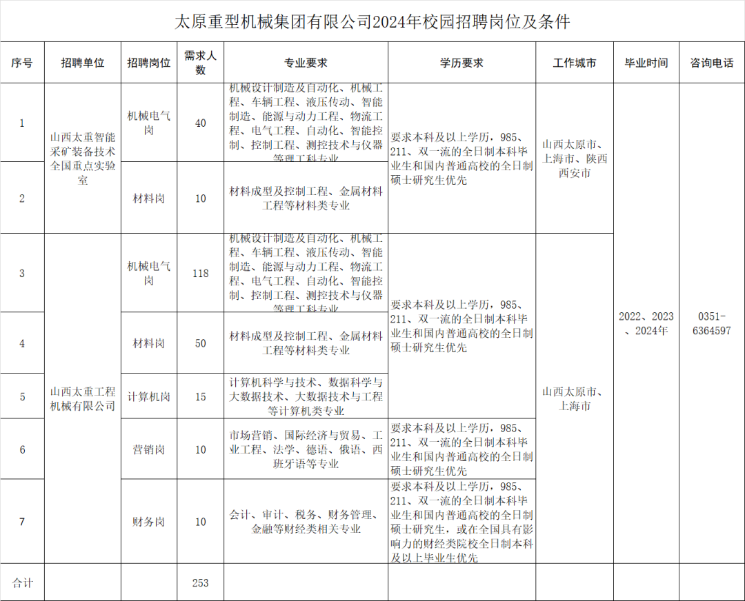 本次招聘253人,详见附件《太重集团2024年校园招聘岗位及条件》,报名基本条件如下: