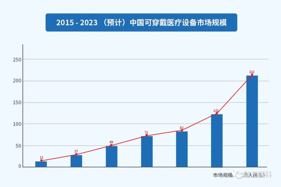 据相关的数据统计,中国可穿戴医疗设备市场规模从2015年的12亿元人民币增长到2020年的122亿元,表现出强劲增长态势,到2023年该数值将超过200亿元。
