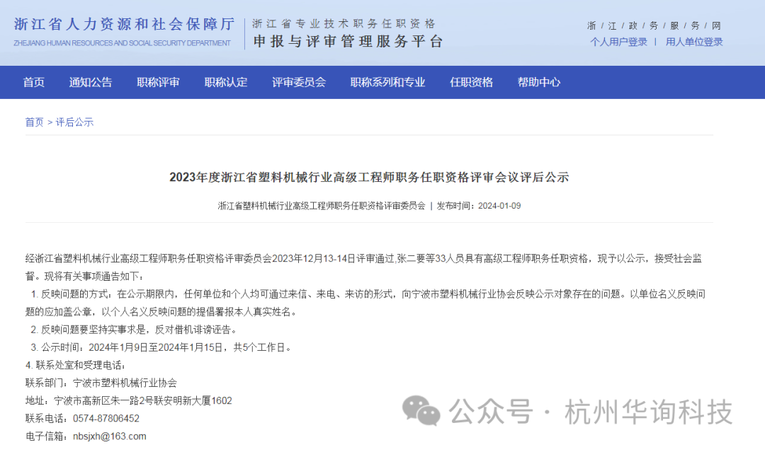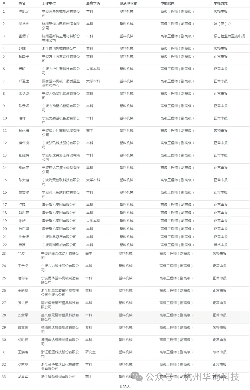 经浙江省塑料机械行业高级工程师职务任职资格评审委员会2023年12月13-14日评审通过,张二要等33人员具有高级工程师职务任职资格,现予以公示,接受社会监督。现将有关事项通告如下: