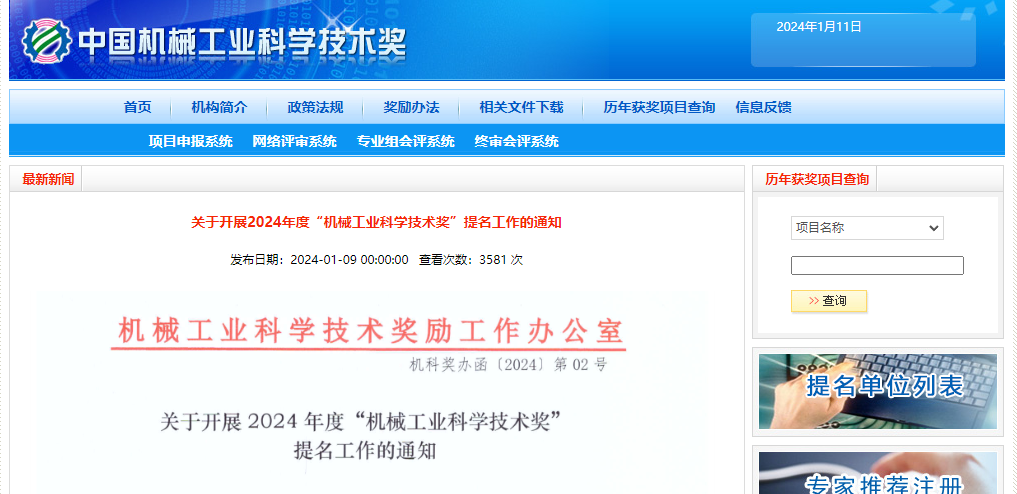 2024年度“机械工业科学技术奖”提名工作将于2024年1月9日至3月31日进行。机械工业科学技术奖励工作办公室自本通知发布之日起,开始受理提名项目。现将有关事项通知如下: