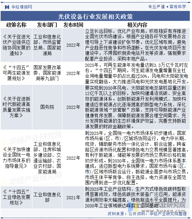 光伏设备指光伏制造型企业用于生产原料、电池组件、零部件等产品中使用的,并在反复使用中基本保持原有实物形态和功能的机器设备。光伏设备的分类有多种,其中一种分类方式将其分为硅棒/硅锭制造设备、硅片/晶圆制造设备、电池片制造设备、晶体硅电池组件制造设备和薄膜组件制造设备等五大类。另一种分类方式将其分为硅料设备、硅片设备、电池设备和组件设备四大类。光伏设备行业的发展离不开相关政策的支持。为了鼓励光伏行业的发展,政府出台了补贴政策,这些政策通常包括对光伏发电项目的投资补贴、运营补贴以及税收优惠等。未来,随着全球气候变化和能源结构转型的趋势加强,光伏设备行业将继续受益于政策的支持。