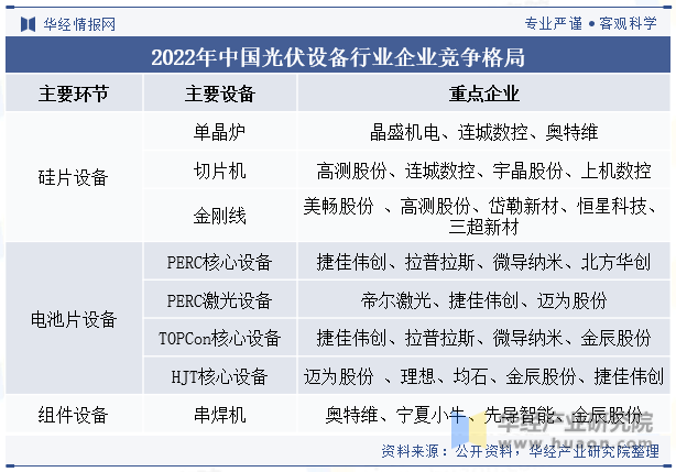 光伏设备行业的产业链主要包括原材料及设备、光伏组件与零部件、发电与应用产品等相关产业。产业链的上游主要是原材料及设备产业,包括硅料、光伏玻璃、EVA胶膜、背板、边框材料等原材料,以及硅片切割设备、光伏电池制造设备、光伏封装设备等。下游则是发电与应用产品相关产业,包括光伏电站建设、光伏系统集成与运维、光伏应用产品开发与制造等。光伏设备行业的产业链上下游发展是相互促进的,光伏设备行业下游是光伏设备产业链的最终环节,也是光伏设备实现其价值的关键环节。下游的需求又反过来促进上游和中游的进一步创新和优化。数据显示,2022年中国光伏发电装机容量39261万千瓦,同比增长28.1%。随着技术的不断进步和产业政策的支持,中国光伏设备行业得到了迅速发展。2022年我国光伏设备产业规模达到410亿元,同比增长2.5%。预计中国光伏设备市场规模将继续保持快速增长态势,并逐渐成为全球光伏设备市场的重要力量。中国光伏设备行业的专利申请数量呈现逐年增长的趋势。根据数据,2018年中国光伏设备专利申请数量为324项;2021年,这一数字已经增长到了544项,年均复合增长率达到了18.9%。到了2022年,光伏设备相关专利申请数量更是达到了678项,同比增长了24.6%。光伏设备行业的竞争格局正在不断变化。随着技术的不断进步和产业政策的支持,越来越多的企业开始进入光伏设备领域,市场竞争日趋激烈。其中,重点企业包括捷佳伟创、连城数控、奥特维等。这些企业在光伏设备领域具有较强的研发实力和生产能力,拥有较为完善的产业链和销售渠道,具备较高的市场知名度和品牌价值。随着全球能源结构的转型和气候变化的挑战,光伏设备行业正迎来前所未有的发展机遇。技术进步、政策支持和市场需求的增长,共同推动着光伏设备行业的快速发展。光伏设备行业将继续朝着高效能、低成本、高可靠性的方向发展。新一代的光伏电池技术和组件设计将进一步提高光电转换效率和降低生产成本,为光伏设备的广泛应用提供更多的可能性。同时,随着智能化和自动化技术的引入,光伏设备的生产过程将更加高效和精准,提高产品的质量和生产效率。随着光伏发电在能源结构中的占比逐渐提高,光伏设备的需求将进一步增长。除了传统的光伏电站建设,光伏设备还将应用于分布式发电、储能、智能电网等领域,为光伏设备行业带来更多的商机。投资沃土