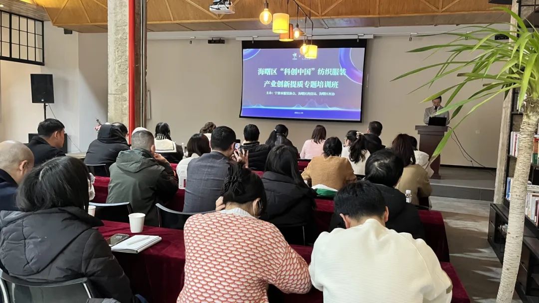 为进一步深入推动海曙“科创中国”省级试点区建设,有效提升纺织服装企业自主创新能力,1月10日下午,由宁波市服装协会、海曙区科技局、海曙区科协主办的“科创中国”纺织服装产业创新提质专题培训班顺利举办。来自雅戈尔、博洋、狮丹努等20余家企业代表到场参加。