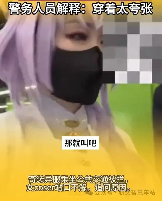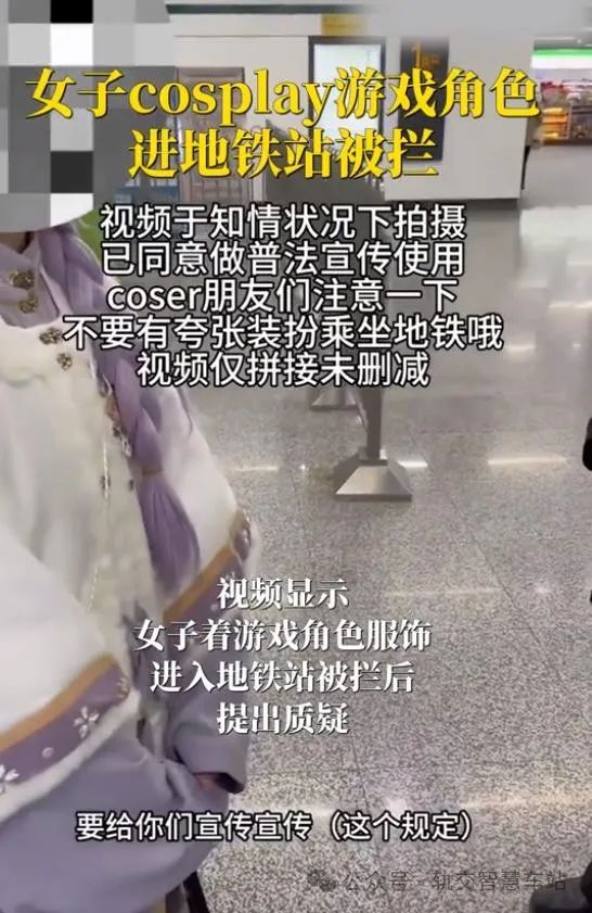 最近,有女子cosplay游戏角色坐地铁被拦,就有安检人员追问原因,女孩就问了“请问我为什么不可以进地铁站呢”。于是,安检员就向管理人员反映此事。