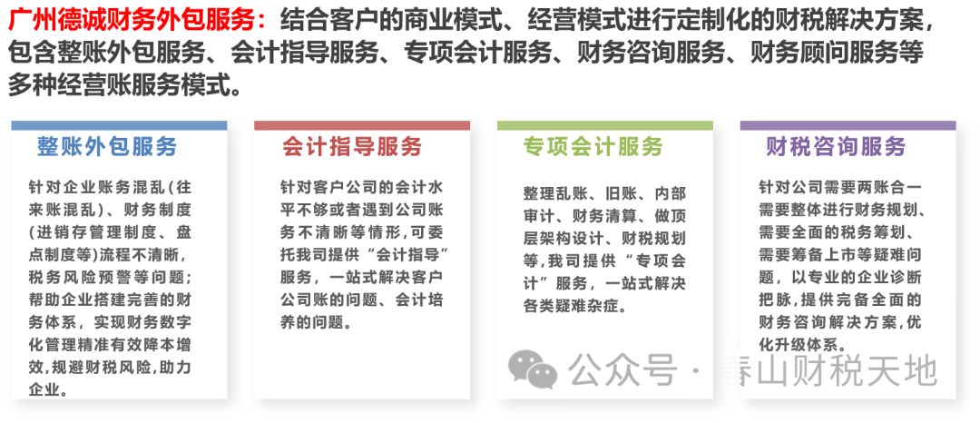 广州德诚坚持以客户需求为导向,为财务和企业赋能转型升级专注于中小民营企业,提供财务外包一站式服务!