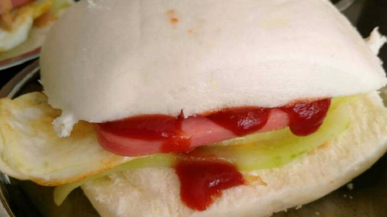 馒头夹火腿、蘑菇炒蛋、蔬菜疙瘩汤