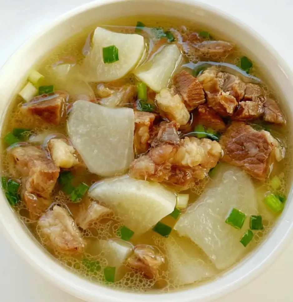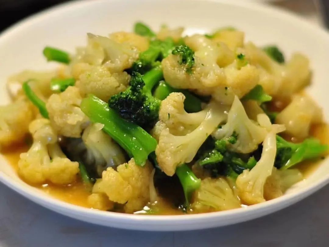 萝卜炖牛腩、清炒有机菜花、杂面小馒头、牛奶小馒头、象眼汤