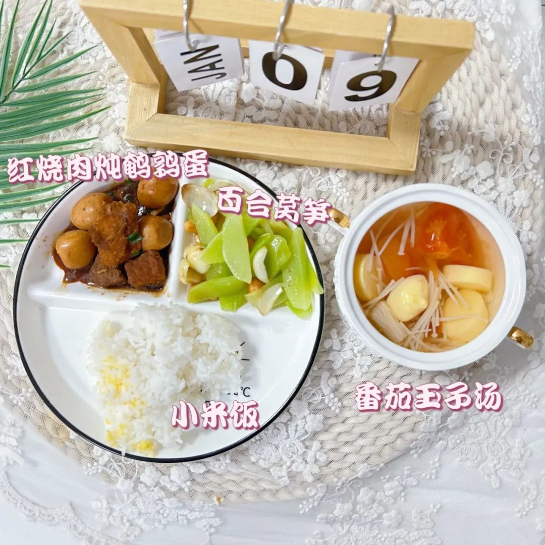 小米饭、红烧肉炖鹌鹑蛋、百合莴笋、番茄玉子汤
