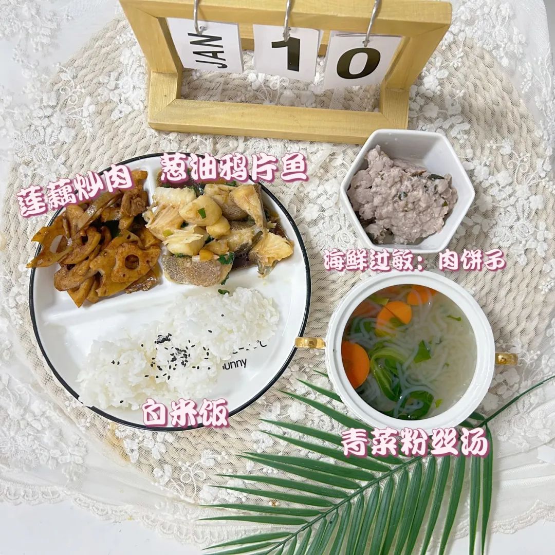 白米饭、莲藕炒肉、葱油鸦片鱼、青菜粉丝汤