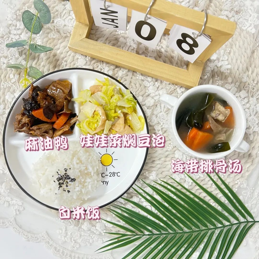 白米饭、麻油鸭、娃娃菜焖豆泡、海带排骨汤