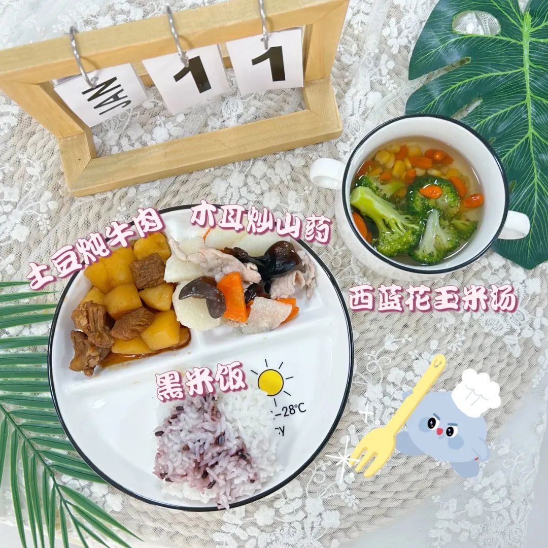 黑米饭、土豆炖牛肉、木耳炒山药、西蓝花玉米汤