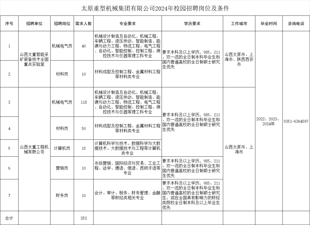 本次招聘253人,详见附件《太重集团2024年校园招聘岗位及条件》,报名基本条件如下: