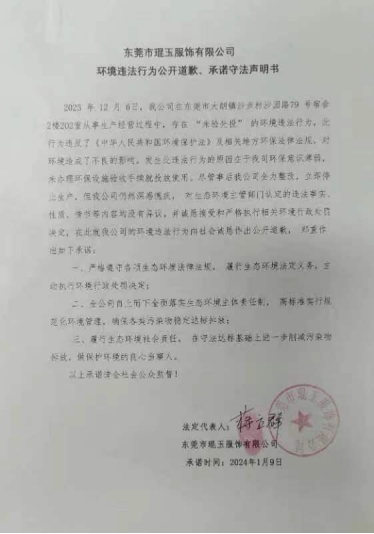 东莞市琨玉服饰有限公司环境违法行为公开道歉、承诺守法声明书