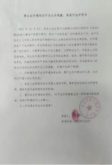 蒋立众环境违法行为公开道歉、承诺守法声明书