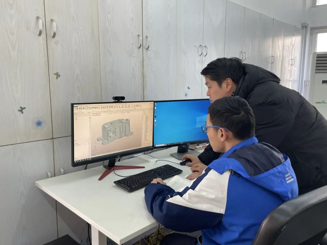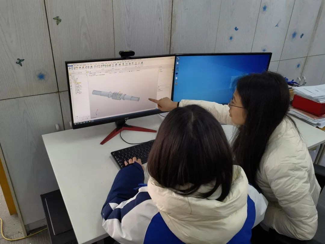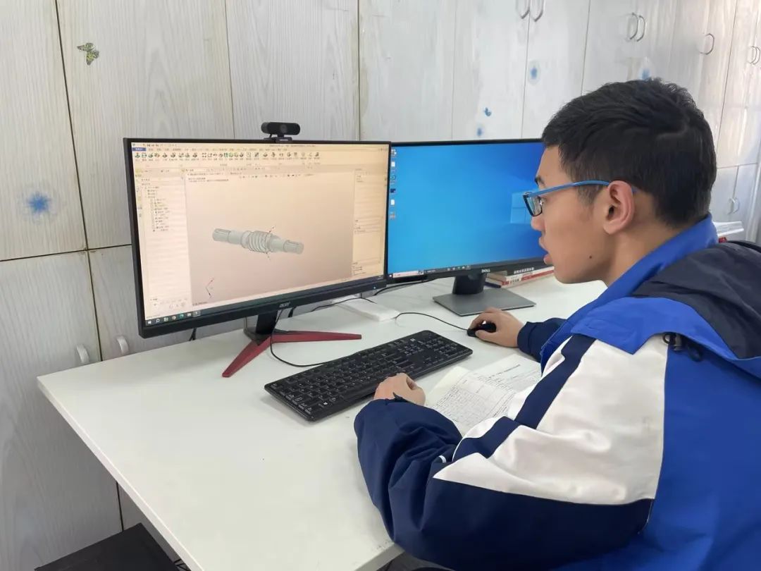 赛前,两位指导老师帮助学生分析总结知识点和技能点,对实操部分的机械产品测绘与建模、零件设计与增材制造、机械产品工程图设计以及零件精度的综合检测四个模块进行高强度集训。两位参赛学生相互切磋,取长补短,在知识和技能上有了明显的提升。师生每天一起合练、研究,不断提高效率,增加默契度。