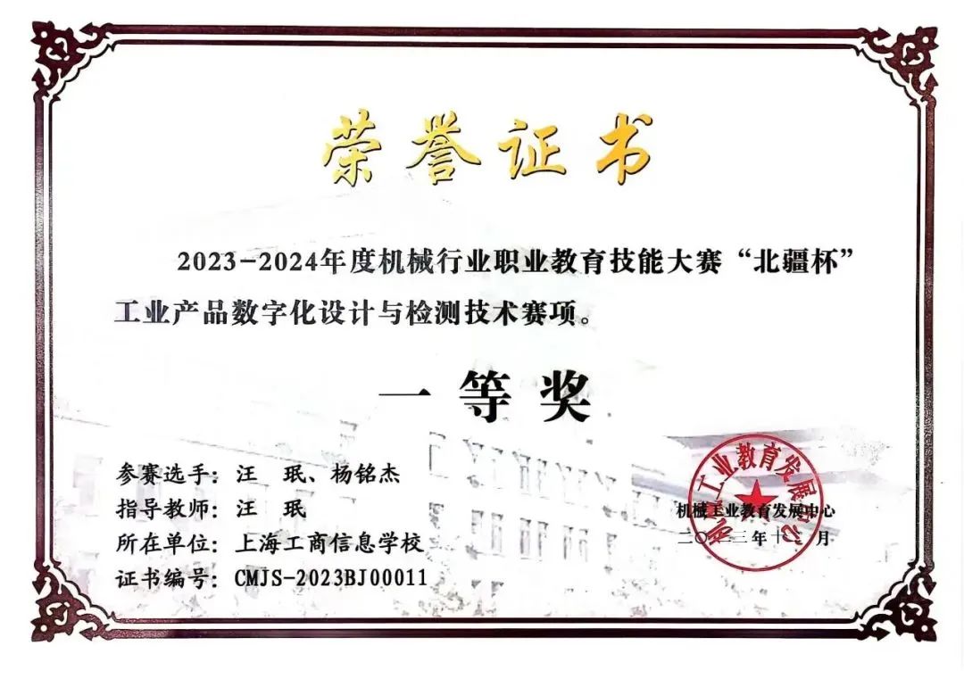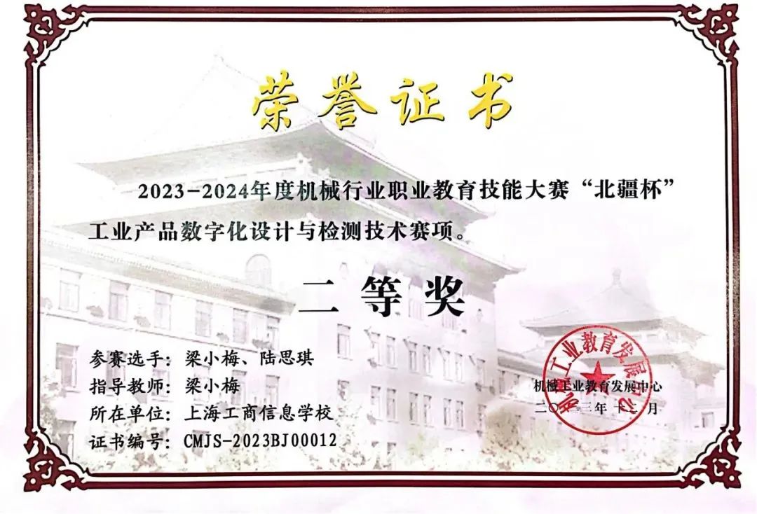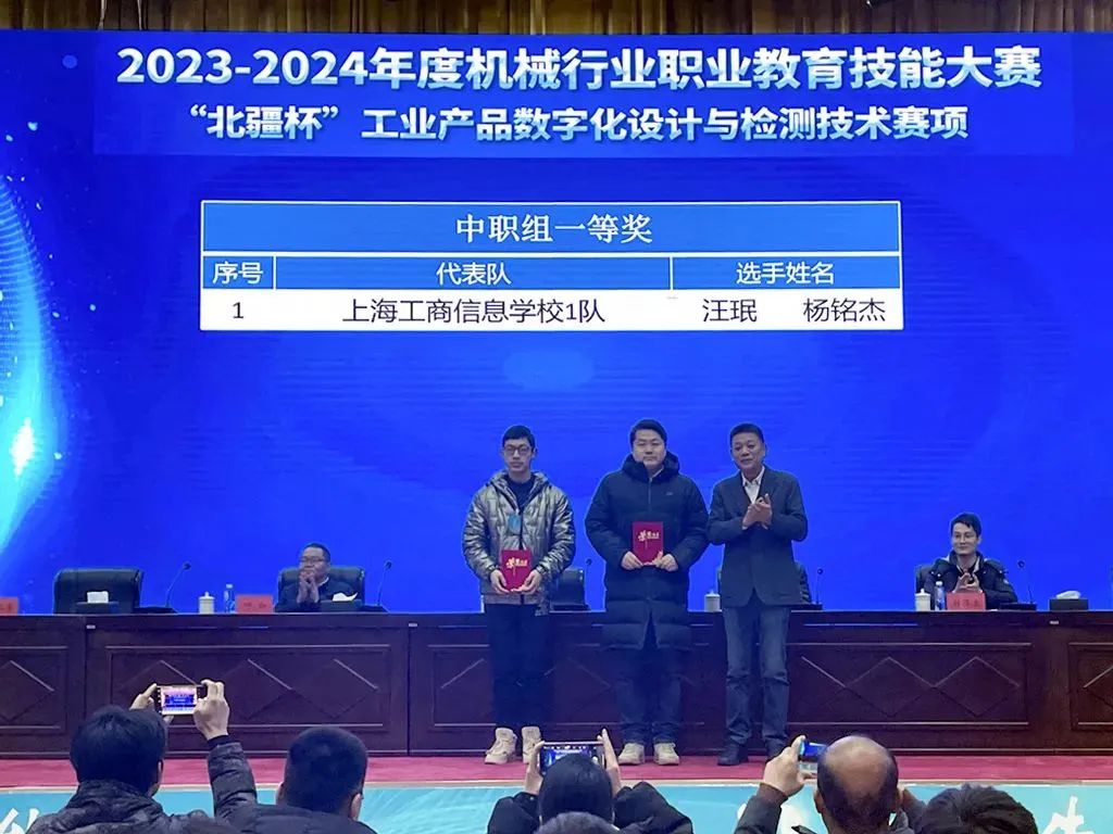 本次比赛为师生同台赛,教师既是指导老师也是参赛选手。上海工商信息学校机电信息专业部共派出两支参赛队伍。一队汪珉老师与22中本数控2班杨铭杰同学获中职组一等奖,汪珉老师获中职组优秀指导教师称号;二队梁小梅老师与22中本数控1班陆思琪同学获中职组二等奖。