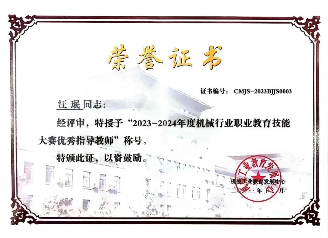 “选手在平日训练中表现出色,为何一旦步入赛场就掉链子?”抱着这样一份疑惑,我选择与选手共同组队参加今年全国机械行业职业技能大赛。在比赛过程中,我深入观察选手的每一个细节,从赛前准备到赛场表现,从心理素质到技术水平。经过一番探索,发现了一些关键问题,这为今后的竞赛指导提供了新的思路和训练方法。这次师生组全国竞赛的经历,让我能够有机会沉下心来,不断精进专业技术,与学生一道,在实践中不断学习,不断提高。我深刻地认识到,竞赛不仅是对选手技能水平的检验,更是对教师教学能力的挑战。在今后的教学工作中,我将不断总结经验,积极探索新的方法,不断提高成绩,助力每位“青藤学子”在大赛中脱颖而出,实现梦想。