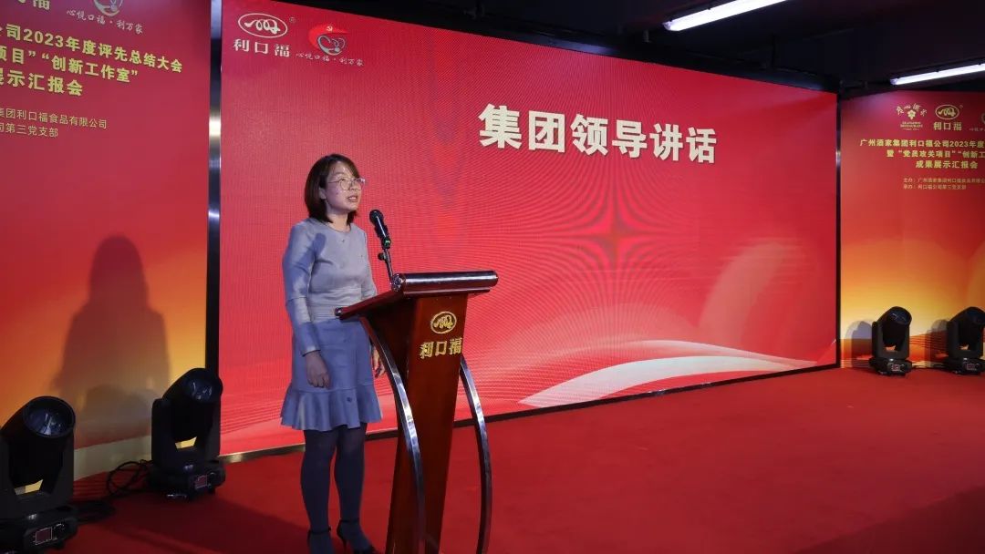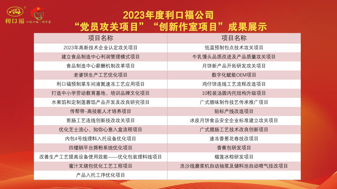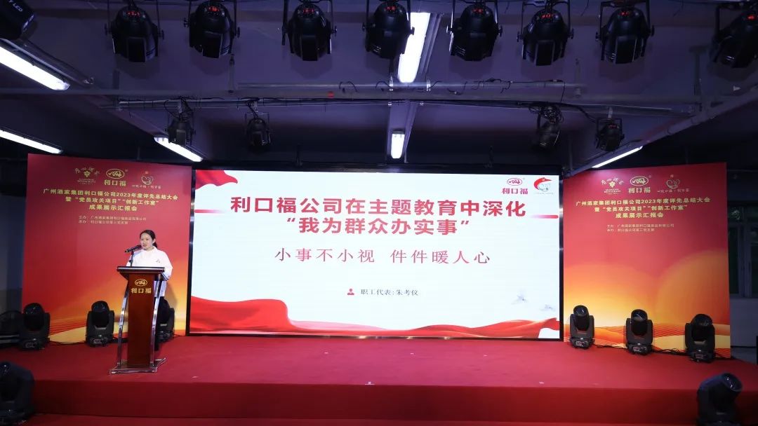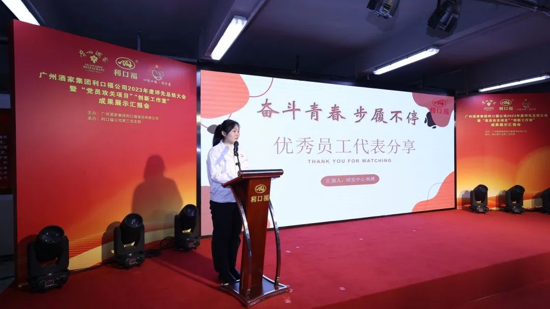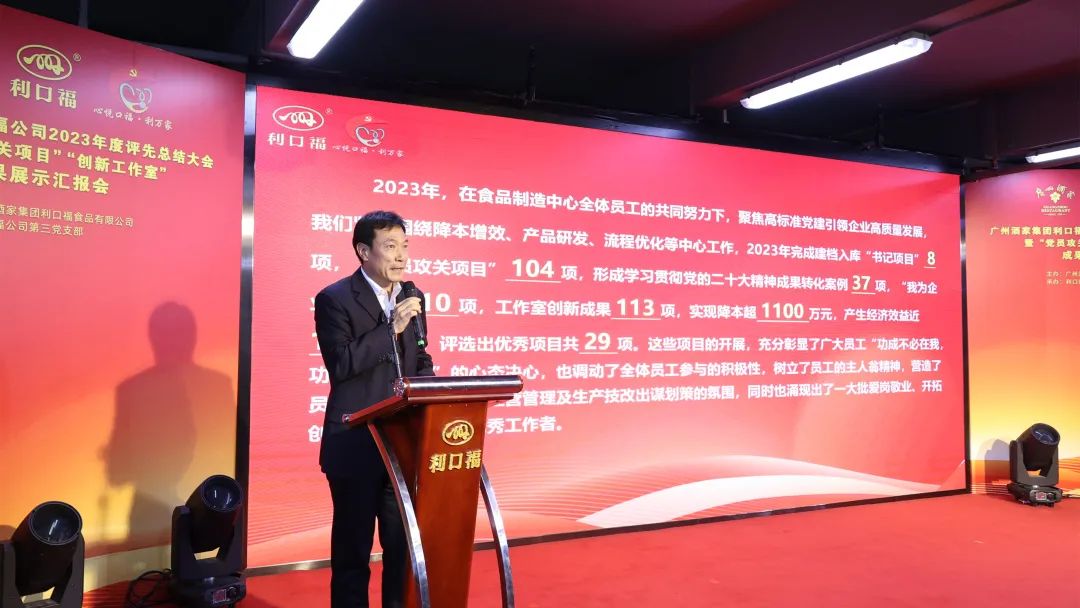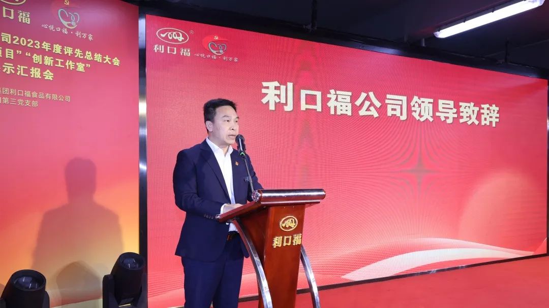 大会展播了利口福公司党委创建的“心悦口福·利万家”党建品牌视频,展示了近年来公司党建与生产经营深度融合的显著成效,回顾了2023年度企业、个人获得的重要荣誉。2023年,利口福公司坚持党建工作和生产经营工作目标同向、部署同步,全年累计完成“书记、党员攻关项目”“创新工作室攻关项目”超200项,实现降本超1100万元,产生经济效益超1.99亿元。公司技术骨干在各类职业技能竞赛中奋勇争先,共获国家级、省市级奖项13人次。广大干部职工立足岗位作贡献、担当作为勇争先,涌现出一批实绩突出的“十佳百优”先进典型。