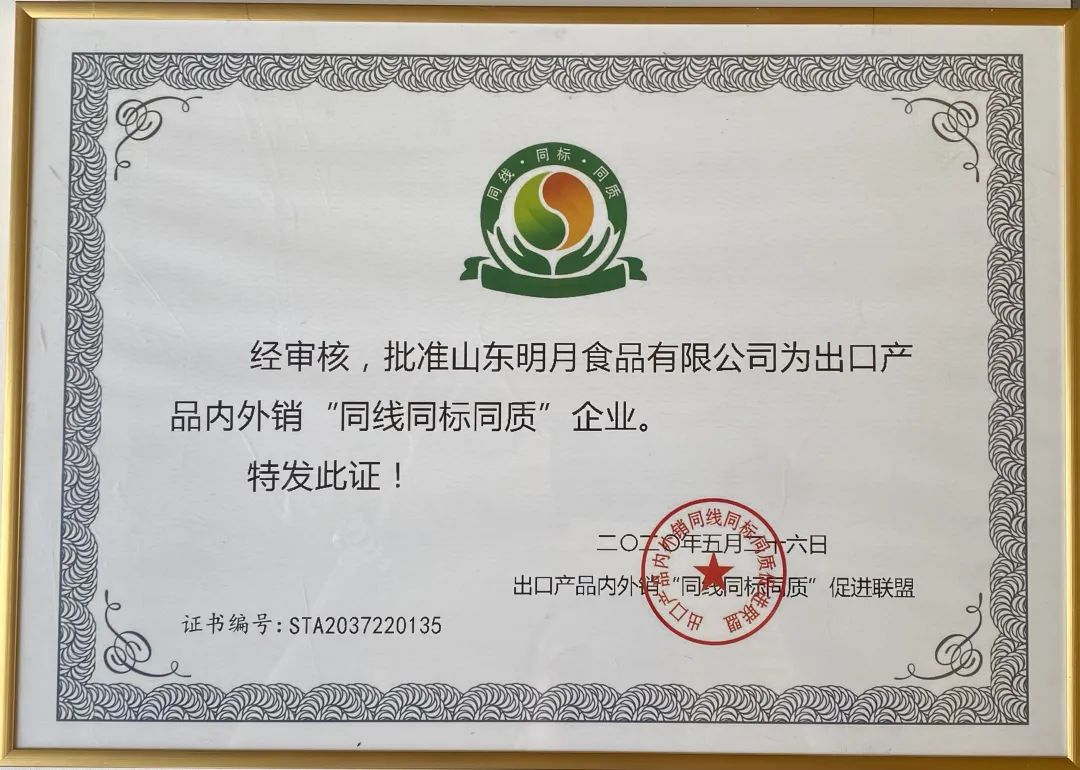 在过去二十多年里,山东明月食品有限公司始终坚持开拓创新,坚持可持续发展,坚守社会责任。公司获得地方政府颁发的各种奖励和荣誉,包括“东港区优秀企业”、“三庄镇十佳企业”、“文明企业”、“农业产业化重点龙头企业”、“中国质量诚信企业”等。
