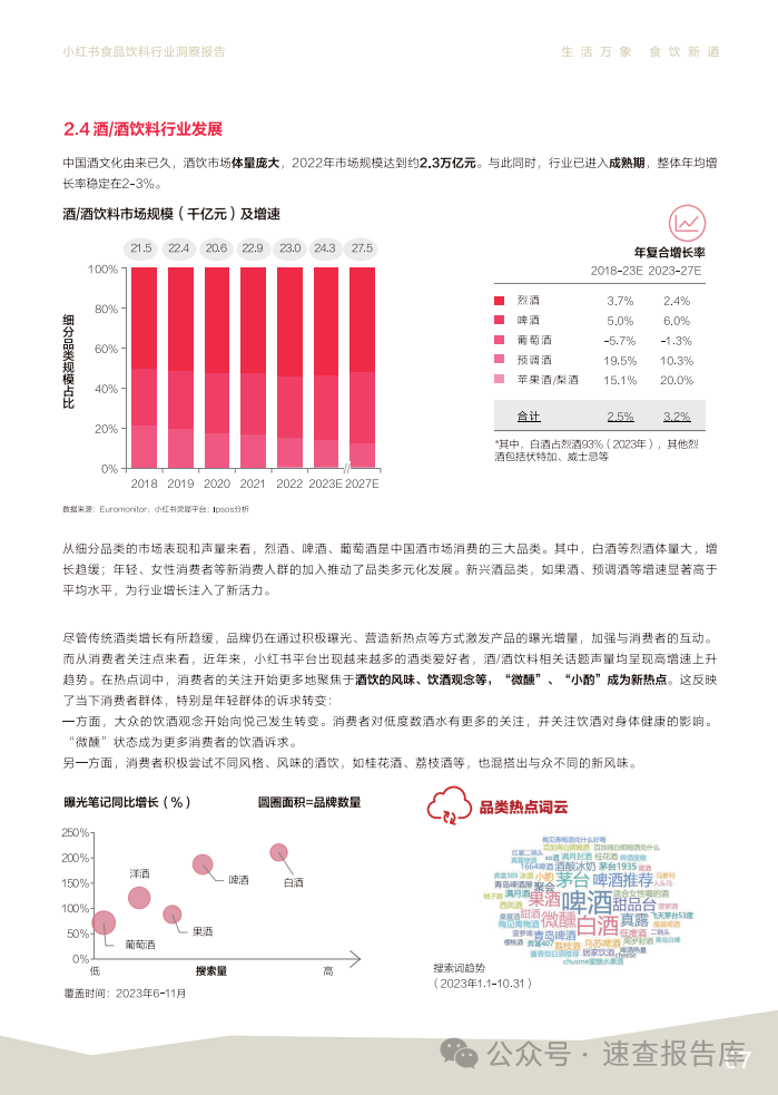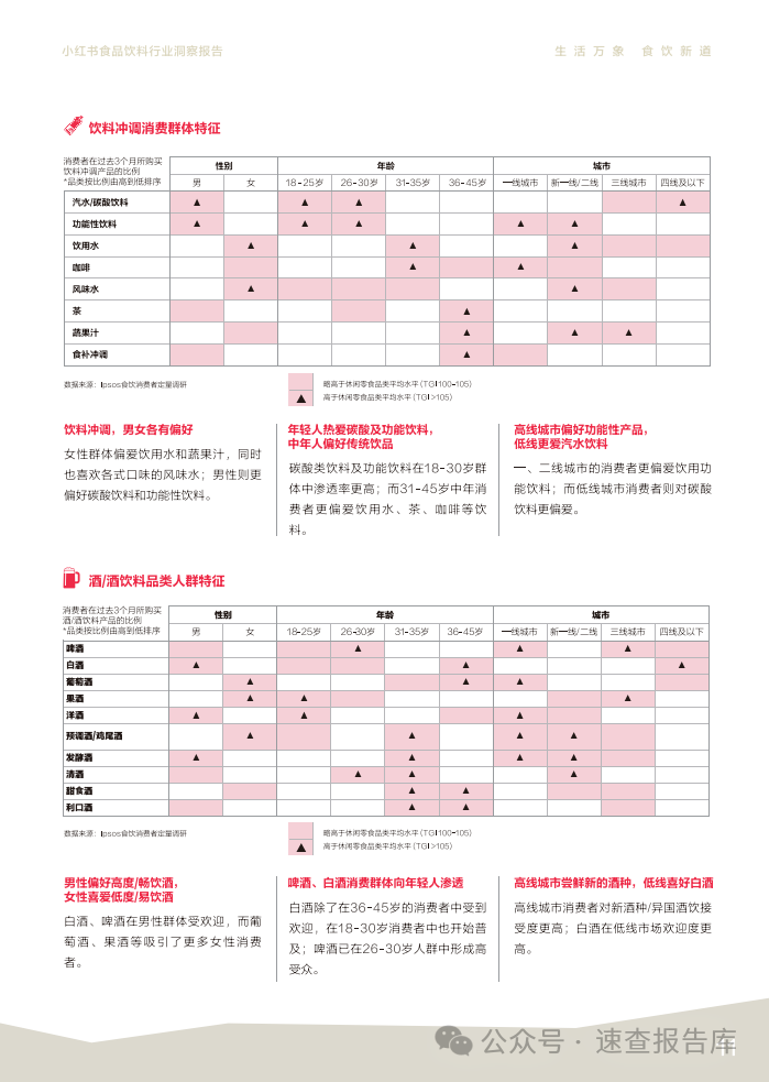 食品饮料行业具备强劲韧性,同时也是一个高速创新的行业一行业产品持续快速创新、新品牌不断涌现,而赢得市场的关键就在于品牌是否能够精准把握消费者需求,成功打造消费者心智。当今食饮消费者的需求呈现多层次发展的特色,而各品类的目标消费群体边界也变得模糊。这就要求我们不仅仅局限于满足传统意义上的功能、情感诉求,而需要在此基础上多方面结合消费者所在的圈层、社交、场景等各维度需求。在《小红书食品饮料行业洞察报告》中具体分析了消费者的需求变化,以及对食品饮料品啤的启示。