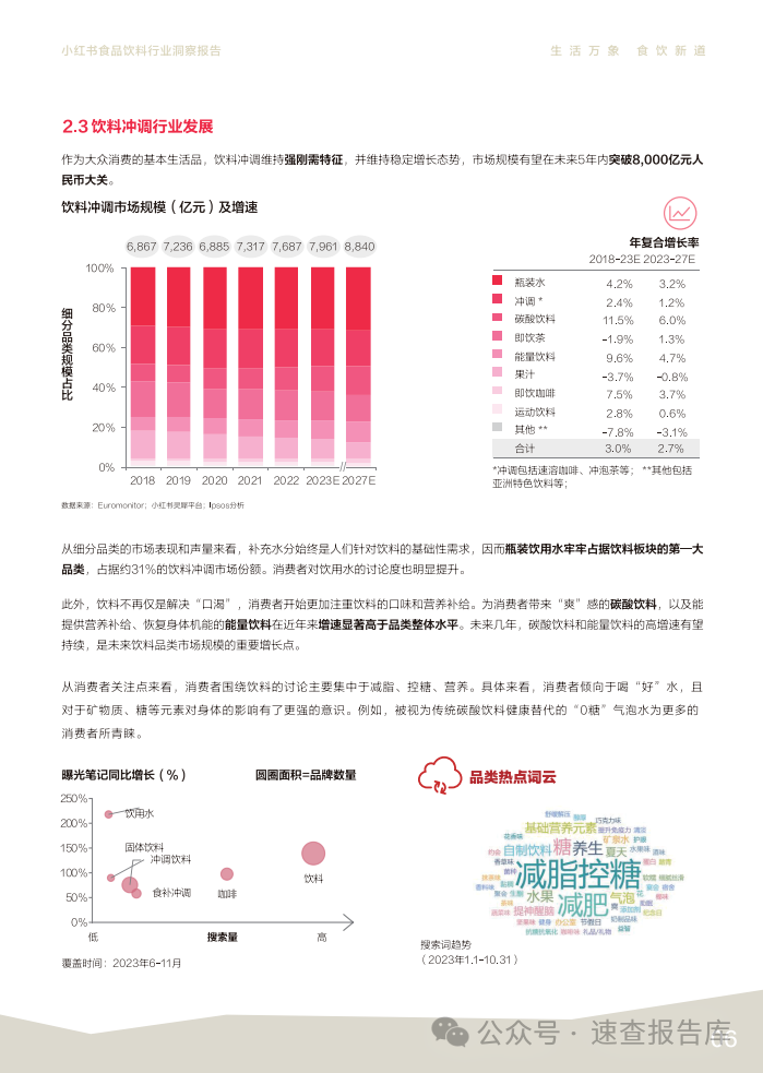 新消费浪潮下,年轻一代的消费者在获取信息时呈现出多元化、碎片化的特点,为品牌营销带来新的可能。消费者正逐渐实现从信息接受者到内容创造者的角色转变,人们比以往更愿意分享自己的体验,更积极地与品牌互动,这在食品饮科行业里体现尤为明显。以小红书为代表的社媒平台已经成为品牌连接消费者的主要阵地。在小红书上,我们看到各类食品饮料话题快速增长、引爆热点,小红书已经成为食品饮料行业的“趋势生长站”,为品牌获取用户反馈、产品创新等带来新思路。