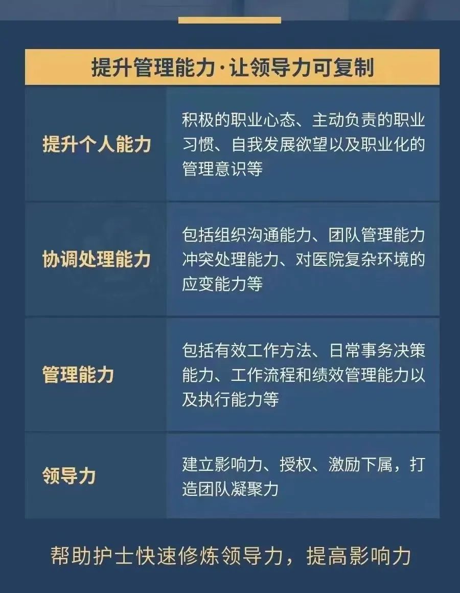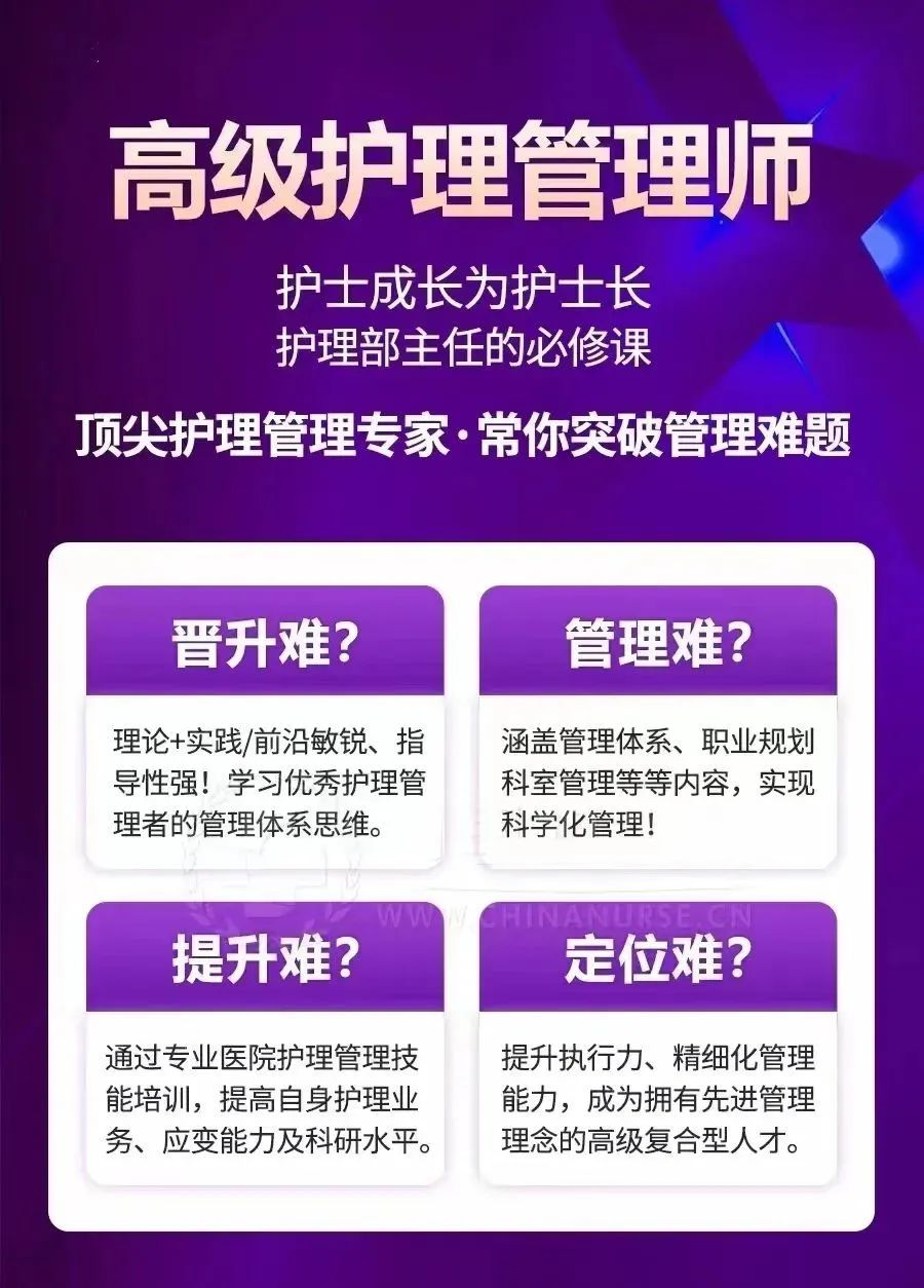 【高级护理管理师】精英培训课程,以帮助护士「晋升」、护士长及各级护理管理工作者「突破管理瓶颈」,实现从专业护理人才向综合管理人才的华丽转身。