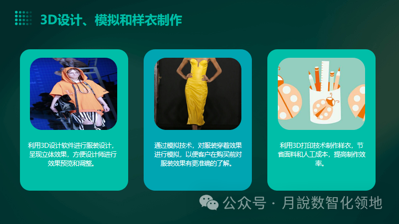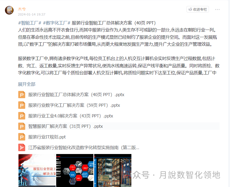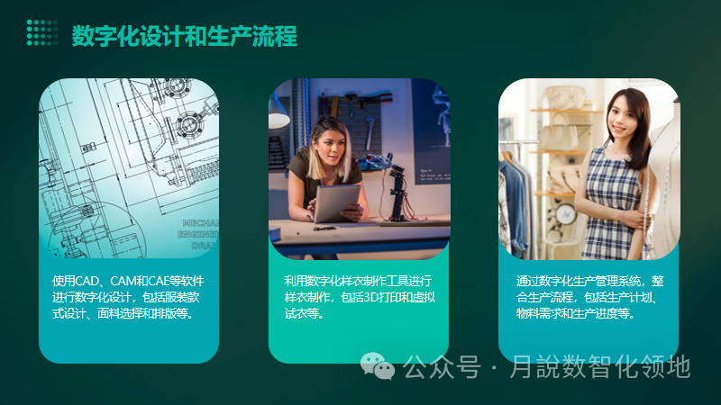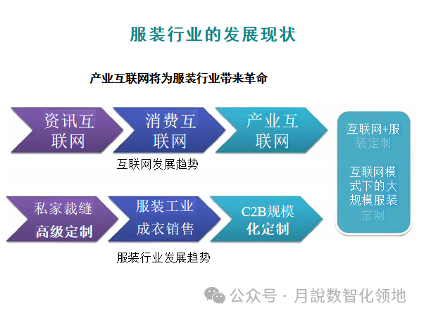 人们的生活永远离不开衣食住行,而其中服装行业作为人类生存不可或缺的一部分,永远走在朝阳行业一列。但是在革命性技术出现之前,目前传统的生产模式显然已经制约了服装企业的提升空间。而面对这一发展瓶颈,以“数字工厂”的解决方案打破市场僵局,从而更大程度地发掘生产潜力,提升广大企业的生产管理效益。服装数字工厂中,拥有诸多数字化产线,每位员工机台上的人机交互计算机会实时反馈生产过程数据,包括计数、完工、返工数量,实时反馈生产异常状况,使流水线高速运转,保证产线平衡和产品质量。同时将质检、数字化数字化,可以将工厂每个质检台部署人机交互计算机,将质检问题实时下达至工位,保证产品质量,工厂中组长、管理者也可以通过平板移动式办公,随时随地派工调度、寄件确认,实时跟踪实际产量,确保每日任务完成跟踪生产,这样一来就可以更大程度地保障工厂生产过程。那么,数字化工厂方案有哪些优势呢?解决方案是什么?分享几份服装行业数字化工厂整体解决方案:服装行业智能工厂总体解决方案(40页 PPT)、服装行业工业4.0解决方案(43页 PPT)服装行业数字化工厂解决方案(59页 PPT)智慧服装厂解决方案(31页 PPT),该方案涉及到数字化工厂的设计,产品从设计端经过制造,营销,物流,到客户端全生命周期的梳理,软件的匹配和设计,自动化产线的配套,工业网络的搭建等等诸多方面,值得参考借鉴~下载方式见文末,附服装行业IT规划、灯塔工厂架构设计方案(61页 PPT)企业数字化转型之路——灯塔工厂(51页 PPT)、江苏省服装行业智能化改造数字化转型实施指南(第二版))···等!方案优势:全数字化的服务生产线管理,不仅为企业的生产过程管控提供了强大的数据支撑,而且也为订单的实时跟踪和生产计划的贯彻落实执行提供了保障,数据来自一线,价值同样体现在一线,为数字化工厂的建设提供了基础保障。具体参考解决方案,如下(40页/59页/31页····PPT,文末获取下载完整方案PPT版)服装行业智能工厂总体解决方案(40页 PPT)