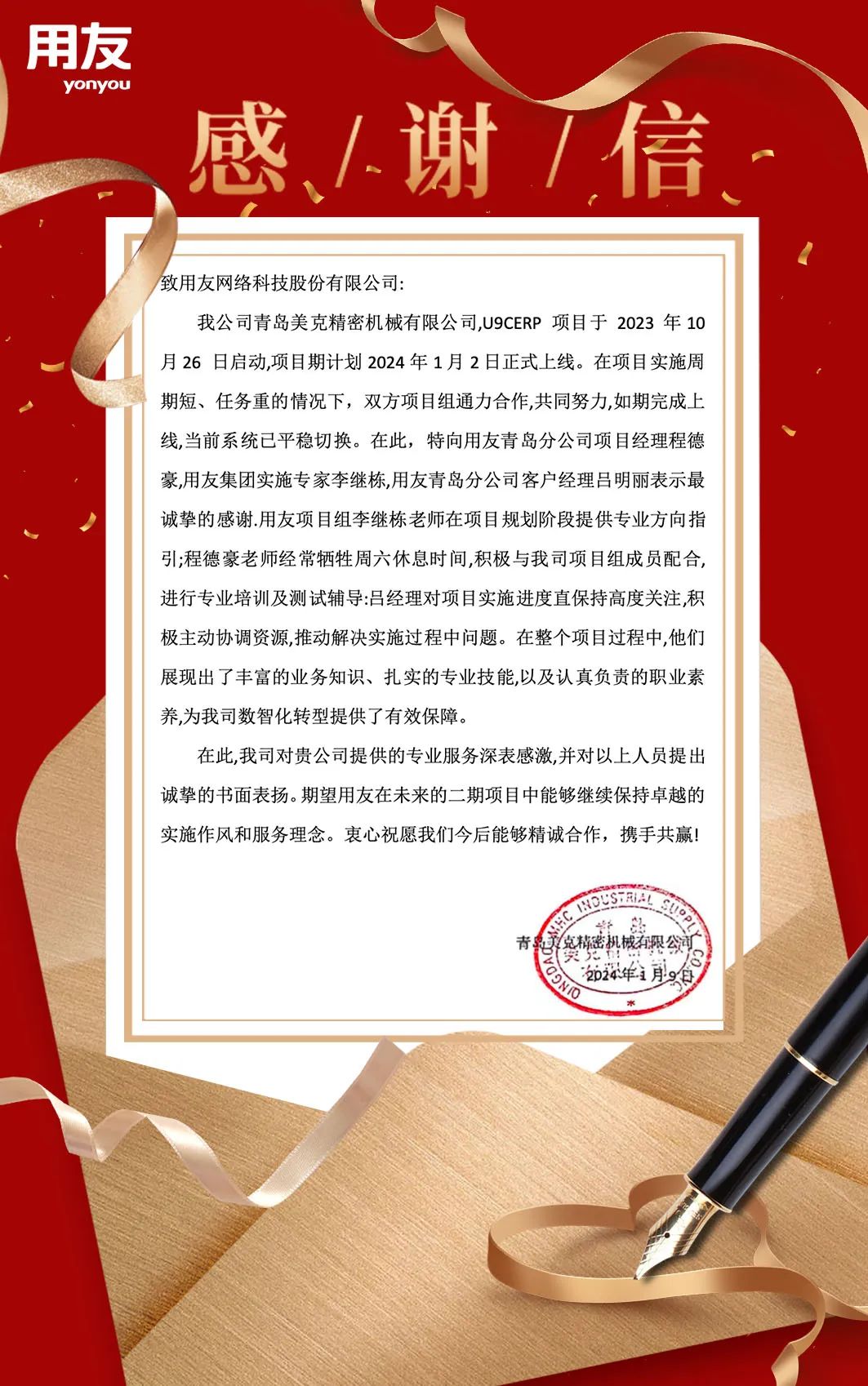 一封来自【青岛美克精密机械有限公司】感谢信!