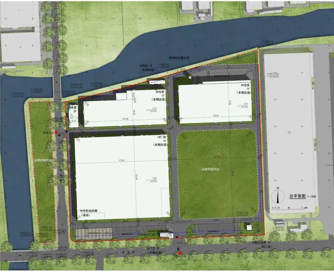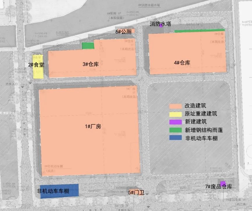 对1栋厂房、2栋仓库、1栋门卫和1栋公厕的外立面及内部功能进行改造,新建1栋食堂、1栋废品仓库、消防水塔及其他配套设施。