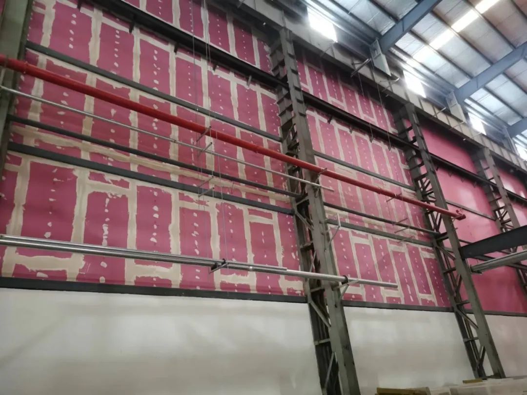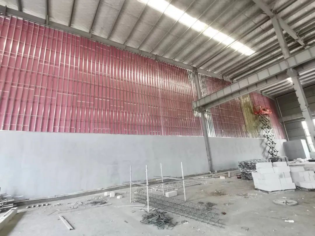 方案二:厂房最高22.7m,超过轻钢龙骨内隔墙最大高度,决定在钢柱间设置钢梁,将轻钢龙骨内隔墙分段固定在钢梁上。