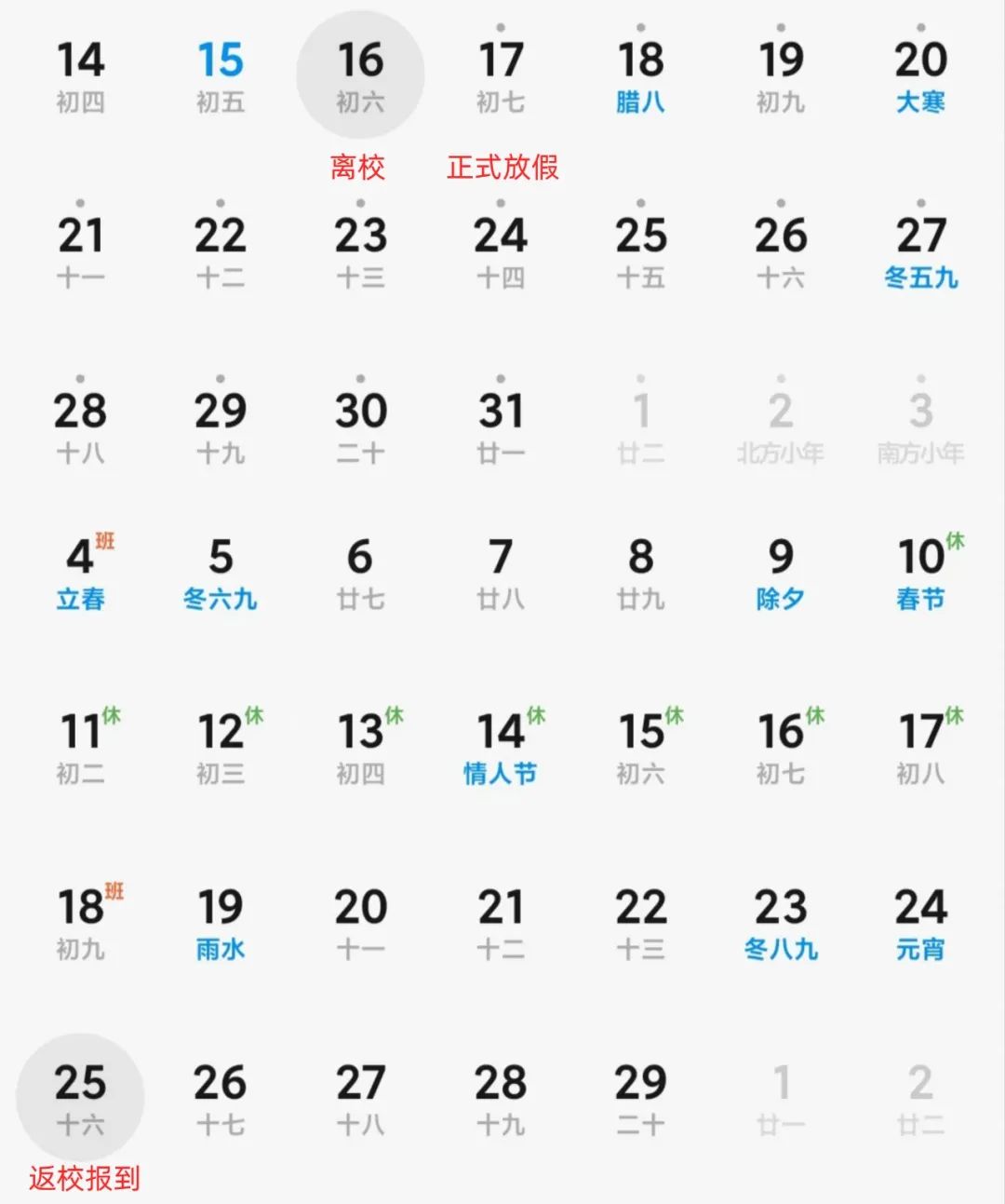 学生于1月16日上午期末考试结束后有序离校,于2月25日回校注册报到,具体回校安排另行通知。请提前做好学生离校、回校接送安排。请合理安排孩子的作息时间,确保孩子规律的作息。