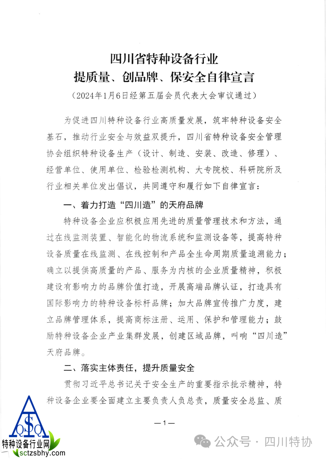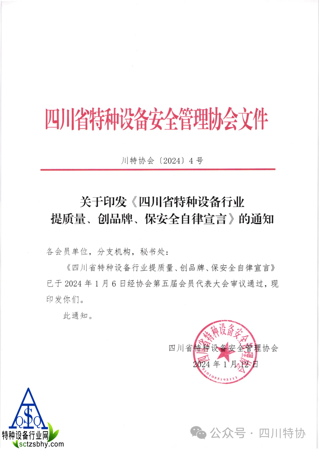 省特安协会关于印发 《四川省特种设备行业 提质量、创品牌、保安全自律宣言》的通知