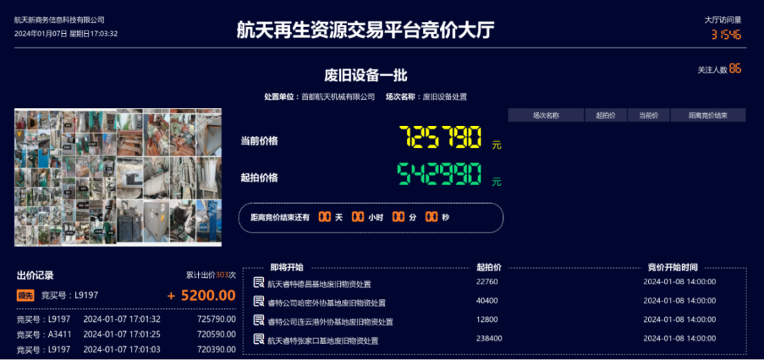 今年以来,该公司先后处置电动单梁起重机、单梁桥式吊车、高温合金细晶铸造炉、细晶铸造真空熔炼炉等设备210余台/套,有效盘活生产面积约530平方米。共发布废旧资产网络竞拍处置14场,累计吸引11887人次围观,155家单位缴纳竞拍保证金并通过资格预审获得竞拍出价资格,83家回收企业参与竞拍出价,累计出价超过1136轮次。最终,全部竞拍标的以2,550,511元的总价成交,较起拍价增值49.95万元,增值率达24.4%。