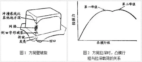 第一峰值与拉深破裂相对应,第二峰值与壁破裂相对应。就平均载荷而言,第一峰值最高。就角部来说,在加工后期由于拉深载荷明显地向角部集中,在第二峰值就往往出现壁破裂。