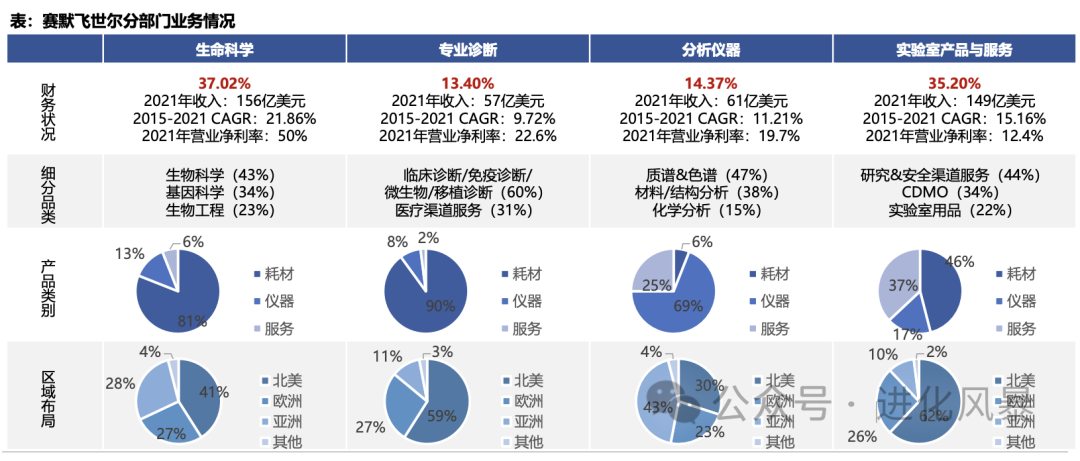 赛默飞将公司业务分为四大板块,每个板块都包含耗材试剂、仪器和服务,以2021年为例: