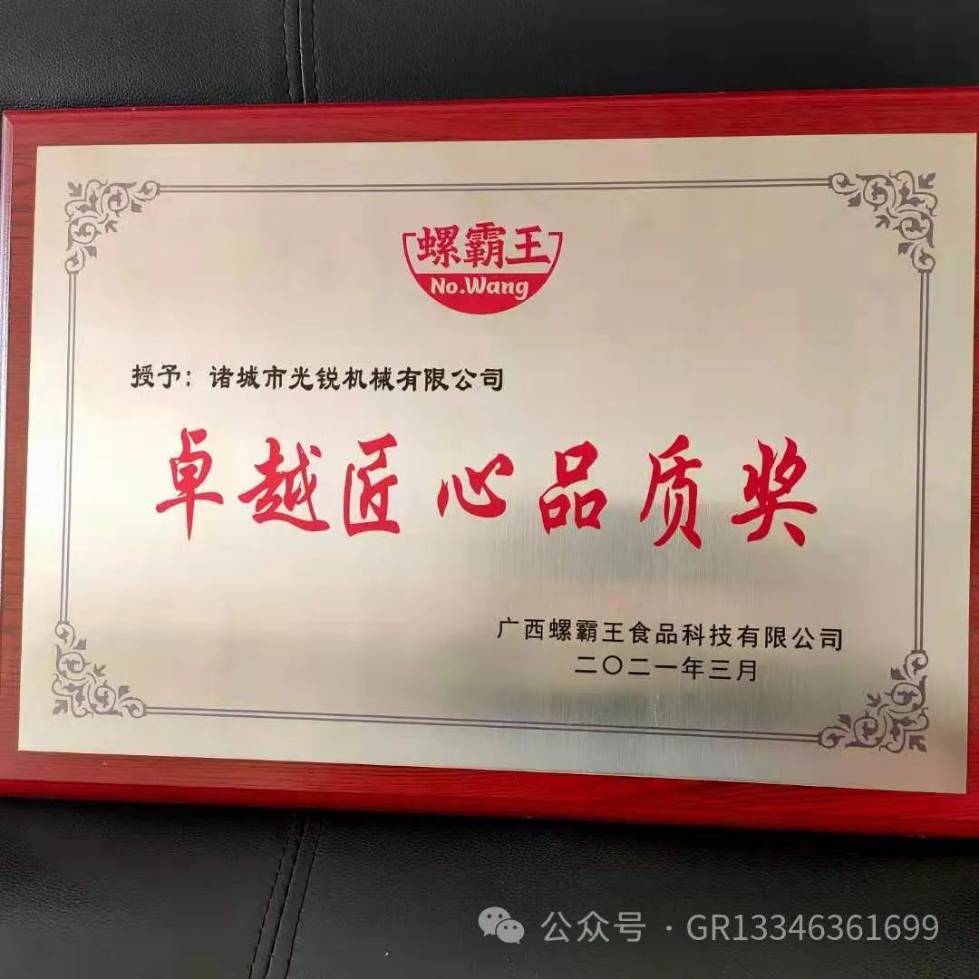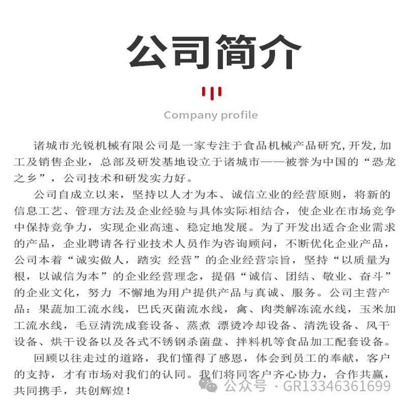 光锐机械有限公司走在食品机械的路上,执着追求卓越的品质。我们深知:机械之美,来自不断的改进、创新。在和客户的沟通、交流中,在设备的使用、维护中,我们用心做事,诚信经营,赢得了越来越多的新、老客户的信赖!光锐机械,荣光睿智,熠熠生辉,我们今后将以更先进的技术、精良的加工和检测设备,可靠的制造质量、严密的质量保证体系和更完善的售后服务,真心对待每一位已经或将要成为我们顾客的您!