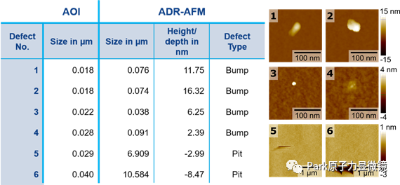 图:用AOI和ADR-AFM测定的缺陷尺寸的直接比较,见左侧表格。右侧显示了所有六种缺陷的相应AFM形貌扫描。突出的缺陷称为Bump,凹陷的缺陷称为Pit。